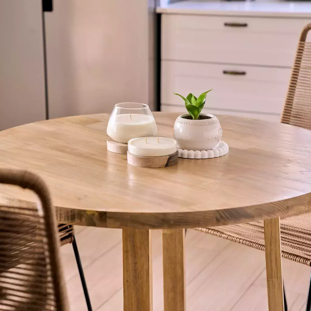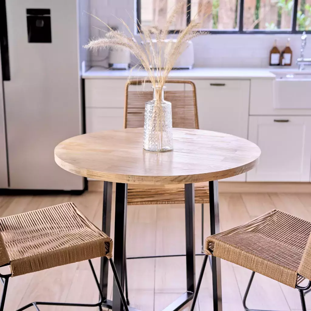 La mesa PAMPA, de diseño redondo y fabricada en madera maciza, combina calidez y solidez, con una base de madera. Su acabado laqueado no solo realza su belleza, sino que también la hace resistente y fácil de limpiar.